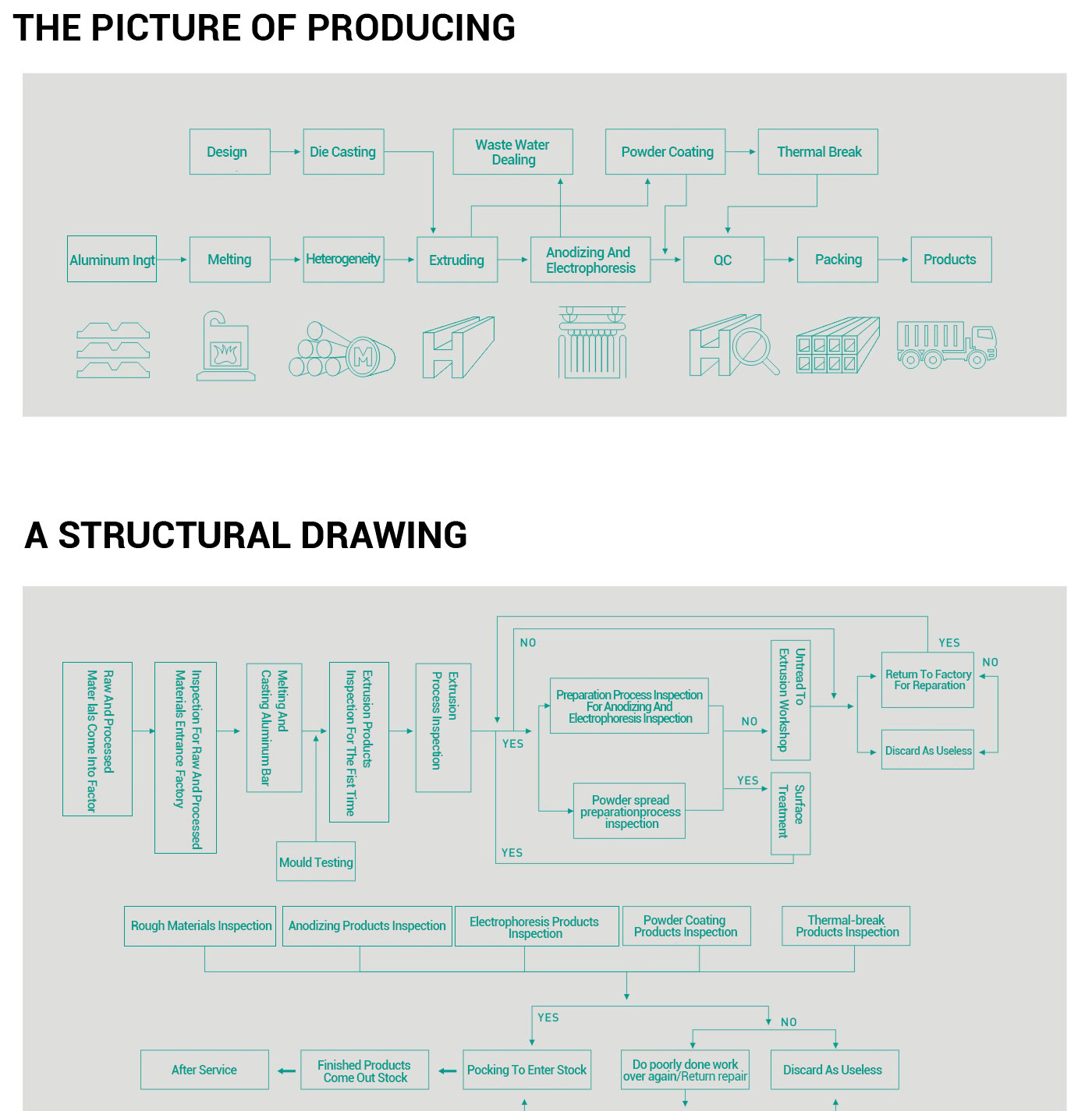 The raw material selection, advanced equipments employment, manufacturing process application and scientific management our aluminum products to the international standard. The whole process includes aluminum ingot, casting, extruding. Oxidation, powder coating. heat insulation, abrasion blasting, detection and packaging.